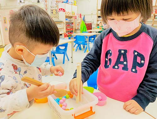 The school focuses on the all-rounded development of children. We provide appropriate life skills training to children of different ages and developmental stages, in order to enhance their hand-eye coordination, abilities to use both hands, fingers flexibility, and thus their overall self-care abilities.
